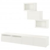 Благодаря нескольким отверстиям на задней панели тумбы под ТВ провода от телевизора и других устройств всегда будут под рукой, но не на виду.Специальное отверстие в верхней панели обеспечит удобное и компактное размещение проводов.Съемные полки позволяют регулировать пространство.Ящики со встроенным нажимным механизмом открываются легким нажатием.Настенные шкафчики позволяют эффективно использовать пространство над телевизором.Два ящика и полки за дверцами обеспечат достаточно места для хранения.Организуйте и оптимизируйте систему для хранения БЕСТО, используя подходящие коробки и вставки.Мы рекомендуем, чтобы тумба была немного шире, чем установленный на ней телевизор. Эта тумба подходит для телевизора до 45 дюймов. Вы можете выбрать телевизор большего размера, если он не тяжелее указанной максимальной нагрузки на верхнюю панель тумбы.Верхняя панель этой тумбы предназначена для телевизора весом макс. 50 кг.Максимальная нагрузка на закрепленный на стене каркас зависит от материала стены.Для различного типа стен требуются разные виды креплений. Выберите подходящие для ваших стен шурупы, дюбели, саморезы и т. п. (не прилагаются).Тумбу под ТВ необходимо крепить к стене с помощью прилагающегося стенного крепежа.Будьте осторожны при обращении с закаленным стеклом! Из-за поврежденных краев и царапин на поверхности стекло может внезапно разбиться.Для функционирования нажимного механизма необходимо пространство между каркасом и фронтальной панелью ящика, чтобы ящик открывался нажатием. Небольшой зазор необходим для обеспечения этой функции и не является недостатком товара.Материалы и уход