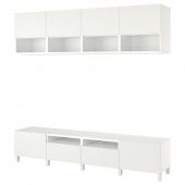 Благодаря нескольким отверстиям на задней панели тумбы под ТВ провода от телевизора и других устройств всегда будут под рукой, но не на виду.Специальное отверстие в верхней панели обеспечит удобное и компактное размещение проводов.Ящики со встроенным нажимным механизмом открываются легким нажатием.Ящики обеспечат более упорядоченное хранение ваших вещей. А полки за дверцами предоставят еще больше места.Ножки делают комбинацию БЕСТО визуально легче, приподнимая модули над полом. Кроме того, такое решение упрощает уборку под шкафом.Съемные полки позволяют регулировать пространство.Настенные шкафчики позволяют эффективно использовать пространство над телевизором.Организуйте и оптимизируйте систему для хранения БЕСТО, используя подходящие коробки и вставки.Мы рекомендуем, чтобы тумба была немного шире, чем установленный на ней телевизор. Эта тумба подходит для телевизора до 99 дюймов. Вы можете выбрать телевизор большего размера, если он не тяжелее указанной максимальной нагрузки на верхнюю панель тумбы.Верхняя панель этой тумбы предназначена для телевизора весом макс. 50 кг.Максимальная нагрузка на закрепленный на стене каркас зависит от материала стены.Для различного типа стен требуются разные виды креплений. Выберите подходящие для ваших стен шурупы, дюбели, саморезы и т. п. (не прилагаются).Эту мебель необходимо крепить к стене с помощью прилагаемого стенного крепежа.Для функционирования нажимного механизма необходимо пространство между каркасом и фронтальной панелью ящика, чтобы ящик открывался нажатием. Небольшой зазор необходим для обеспечения этой функции и не является недостатком товара.Материалы и уход