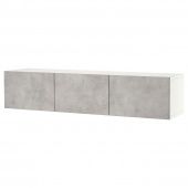 Благодаря слегка текстурированной поверхности фасад КЭЛЛЬВИКЕН напоминает бетон.Чтобы подчеркнуть современный и лаконичный стиль интерьера, тумбу под ТВ БЕСТО можно закрепить на стене. Дополнительный плюс — ножки не будут мешать уборке.Благодаря нескольким отверстиям на задней панели тумбы под ТВ провода от телевизора и других устройств всегда будут под рукой, но не на виду.Специальное отверстие в верхней панели обеспечит удобное и компактное размещение проводов.Съемные полки позволяют регулировать пространство.Вы можете использовать нажимной механизм или устройство для плавного закрывания. В первом варианте для открывания дверцы достаточно слегка нажать на нее. А во втором – гарантировано плавное и бесшумное закрывание.Организуйте и оптимизируйте систему для хранения БЕСТО, используя подходящие коробки и вставки.Мы рекомендуем, чтобы тумба была немного шире, чем установленный на ней телевизор. Эта тумба подходит для телевизора до 72 дюймов. Вы можете выбрать телевизор большего размера, если он не тяжелее указанной максимальной нагрузки на верхнюю панель тумбы.Верхняя панель этой тумбы предназначена для телевизора весом макс. 50 кг.Если вы выберете функцию плавного закрывания, рекомендуем дополнить фасады ручками, чтобы открывать ящики/шкафы было удобнее.Максимальная нагрузка на закрепленный на стене модуль зависит от материала стены.Для различного типа стен требуются разные виды креплений. Выберите подходящие для ваших стен шурупы, дюбели, саморезы и т. п. (не прилагаются).Стоящая на полу тумба под ТВ должна быть закреплена к стене с помощью прилагающего стенного крепежа.Материалы и уход