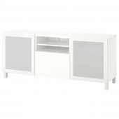 Сетчатые металлические дверцы пропускают сигнал от пульта, поэтому за ними можно разместить электронное оборудование.Благодаря нескольким отверстиям на задней панели тумбы под ТВ провода от телевизора и других устройств всегда будут под рукой, но не на виду.Специальное отверстие в верхней панели обеспечит удобное и компактное размещение проводов.Благодаря встроенному нажимному механизму дверцы и выдвижной ящик закрываются плавно и бесшумно.Съемные полки позволяют регулировать пространство.Организуйте и оптимизируйте систему для хранения БЕСТО, используя подходящие коробки и вставки.Мы рекомендуем, чтобы тумба была немного шире, чем установленный на ней телевизор. Эта тумба подходит для телевизора до 72 дюймов. Вы можете выбрать телевизор большего размера, если он не тяжелее указанной максимальной нагрузки на верхнюю панель тумбы.Верхняя панель этой тумбы предназначена для телевизора весом макс. 50 кг.Если вы выберете функцию плавного закрывания, рекомендуем дополнить фасады ручками, чтобы открывать ящики/шкафы было удобнее.Эту мебель необходимо крепить к стене с помощью прилагаемого стенного крепежа.Материалы и уход