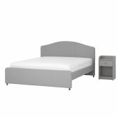 В комплект входит: 1 каркас кровати с обивкой с реечным дном и центральной перекладиной и 1 прикроватная тумба.Матрас и постельное белье продаются отдельно.Задняя сторона изголовья отделана нетканым материалом черного цвета.Материалы и уход